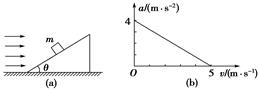 5、计算题 (10分)如图 (a),质量m=1 kg的物体沿倾角θ=37°的固定粗糙斜面由静止开始向下运动,风对物体的作用力沿水平方向向右,其大小与风速v成正比,比例系数用k表示,物体加速度a与风速v的关系如图 (b)所示,(sin 37°=0.6,cos 37°=0.8,g=10 m/s2),求: