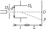 3、简答题 一束电子从静止开始经加速电压U1加速后,以水平速度射入水平放置的两平行金属板中间,如图所示,金属板长为l,两板距离为d,竖直放置的荧光屏距金属板右端为L.若在两金属板间加直流电压U2时,光点偏离中线与荧光屏交点O,打在荧光屏上的P点,求OP的长度.