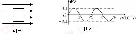 ![]() 参考答案:由图示可知,线圈从图示位置匀速转动180°的过程中,穿过线圈的磁通量始终为零,磁通量始终保持不变,因此在整个过程中没有感应电流产生; 本题解析: 本题难度:一般 2、选择题 一矩形线圈,绕垂直于匀强磁场并位于线圈平面内的固定轴转动。线圈中的感应电动势e随时间t的变化如图所示,下面说法中正确的是:(?) 参考答案:D 本题解析:t1时刻通过线圈的磁通量最大,A错;t2时刻通过线圈的磁通量为0,B错;t3时刻通过线圈的磁通量变化率为0,C错。 本题难度:一般 3、选择题 将阻值为100Ω的电阻丝绕成一个110匝的闭合矩形线圈,让其在匀强磁场中绕垂直于磁场方向的轴匀速转动,产生的感应电动势如图乙所示。则可以判断( ) |