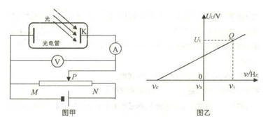 参考答案:ABD 本题解析:太阳的能量来自于内部的核聚变,产生很高的能量,又称为热核反应,故A正确;天然放射现象中,原子核发生衰变,生成新核,同时有中子产生,因此说明了原子核有复杂的结构,故B正确;根据爱因斯坦光电效应方程,可知一束单色光照射到某种金属表面不能发生光电效应,是因为该束光的波长太长,发生光电效应时,入射光的光强一定,频率越高,逸出的光电子的最大初动能就越大,故C错误,D正确;大量的氢原子从n=3的能级向低能级跃迁时只会辐射三种不同频率的光,故E错误。 本题难度:一般 4、选择题 美国物理学家密立根利用图示的电路研究金属的遏制电压Uc与入射光频率 参考答案:CD 本题解析:入射光的频率增大,光电子的最大初动能增大,则需所加电压变大,滑动变阻器的滑片P应向N端移动,A错误;增大入射光的强度,只能增大光电流的大小,而不改变光电子的最大初动能,B错误;由图可得C正确;由 本题难度:一般 5、选择题 不定项选择 参考答案:C 本题解析: 本题难度:简单 Prettiness makes no pottage. 漂亮不能当饭吃. |