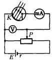 4、实验题 如图所示的实验电路,当用黄光照射光电管中的金属涂层时,毫安表的指针发生了偏转。若将电路中的滑动变阻器的滑片P向右移动到某一位置时,毫安表的读数恰好减小到零,此时电压表读数为U。