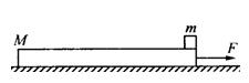 2、计算题 一质量为M=4kg、长为L=3m的木板,在水平向右F=8N的拉力作用下,以ν0=2m/s的速度沿水平面向右匀速运动。某时刻将质量为m=1kg的铁块(看成质点)轻轻地放在木板的最右端,如图.不计铁块与木板间的摩擦。若保持水平拉力不变,请通过计算说明小铁块能否离开木板?若能,进一步求出经过多长时间离开木板?