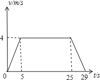 参考答案:(1)根据题意可知升降机的运动情况为:升降机从静止开始先作匀加速直线运动,上升5s速度达到4m/s;接着做速度为4m/s的匀速直线运动,运动时间为20s;最后做匀减速直线运动,初速度为4m/s,运动时间为4s.根据升降机的运动情况,v-t图象如下