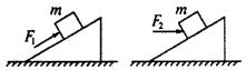 1、选择题 如图所示,分别用两个恒力F1和F2,先后两次将质量为m的物体从静止开始沿着同一个粗糙的固定斜面由底端推到顶端。第一次力F1的方向沿斜面向上,第二次力F2的方向沿水平向右,两次所用的时间相同,在这两个过程中
