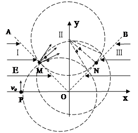 2、计算题 如图所示为某一仪器的部分原理示意图,虚线OA、OB关于y轴对称,