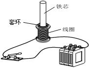 参考答案:B 本题解析:ab边受磁场力竖直向上,由左手定则知,通过ab的电流方向是由a指向b,由右手定则可知当线圈向左移出磁场时,bc边切割磁感线可产生顺时针方向的电流.当然也可以用楞次定律判断当线圈向左移出磁场时,磁通量减小,产生顺时针的感应电流,故B正确.当以ab或cd为轴转动时,在图示位置,导线不切割磁感线,无感应电流产生,故C、D错. 本题难度:一般 3、选择题  老师做了一个奇妙的“跳环实验”。如图所示,她把一个带铁芯的线圈、开关和电源用导线连接起来后,将一金属套环置于线圈上,且使铁芯穿过套环。闭合开关的瞬间,套环立刻跳起。某同学另找来器材再探究此实验。他连接好电路,经重复试验,线圈上的套环均末动。对比老师演示的实验,下列四个选项中,导致套环未动的原因可能是? 参考答案:BD 本题解析:由题意知,闭合开关的瞬间,金属套环要产生感应电流,据楞次定律知线圈的磁场与感应电流的磁场相对,所以套环受到线圈向上的斥力,即在闭合开关的瞬间,套环立刻跳起,由图知实验所用电源是直流电源,A错;线圈中有一匝断了,则电路中没有电流,线圈不会产生磁场,线圈和套环间没有力的作用,套环不会跳起,B对;所选线圈的匝数过多,则小球产生的磁场更强,套环会跳起的更高,C错;所用套环的材料与老师的不同,若是塑料套环不会产生感应电流,线圈和套环间没有力的作用,套环不会跳起,D对. 本题难度:简单 4、选择题  如图所示,均匀绕制的螺线管水平放置,在其正上方附近用绝缘线水平吊起通电直导线A,导线A与螺线管垂直.已知导线A中的电流方向垂直于纸面向里.开关S闭合后,导线A受到通电螺线管磁场的作用力的方向是(  ) |