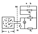 3、选择题 如图所示,边长为L、不可形变的正方形导线框内有半径为r的圆形磁场区域,其磁感应强度B随时间t的变化关系为B=kt(常量k>0).回路中滑动变阻器R的最大阻值为R0,滑动片P位于滑动变阻器中央,定值电阻R1=R0、R2="0.5R" 闭合开关S,电压表的示数为U,不考虑虚线MN右侧导体的感应电动势,则