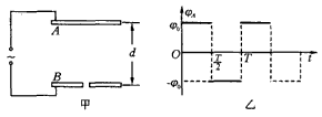5、计算题 如图甲所示,A、B两块金属板水平放置,相距为d=0.6 cm,两板间加有一周期性变化的电压,当B板接地(