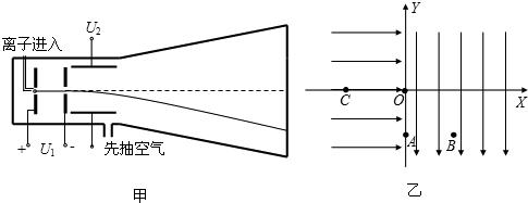 2、计算题 (10分)如图所示,甲图是用来使带正电的离子加速和偏转的装置.乙图为该装置中加速与偏转电场的等效模拟.以y轴为界,左侧为沿x轴正向的匀强电场,场强为E;右侧为沿y轴负方向的匀强电场。已知OA⊥AB,OA=AB,且OB间的电势差为U0。若在x轴的C点无初速地释放一个电荷量为q、质量为m的正离子(不计重力),结果正离子刚好通过B点.求: