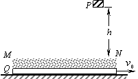 5、简答题  如图所示,P为位于某一高度处的质量为m的物块,Q为位于水平地面上的质量为M=1kg的特殊平板,=,平板与地面间的动摩擦因数 μ=0.02。在板的上表面的上方,存在一定厚度的“相互作用区域”,区域的上边界为MN,如图中划虚线的部分.当物块P进入相互作用区域时,P、Q之间便有相互作用的恒力F=kmg,其中Q对P的作用力竖直向上,且k=41,F对P的作用使P刚好不与Q的上表面接触.在水平方向上,P、Q之间没有相互作用力。P刚从离MN高h =20m处由静止自由落下时,板Q向右运动的速度v0=8m/s,板Q足够长,空气阻力不计。求: