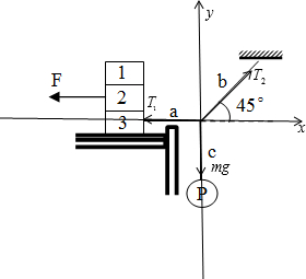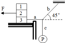 5、简答题 如图所示,三个物块重均为100N,叠放于水平桌面上;小球P重20N,挂在c绳下端,a绳一端系在物块3上,b?绳一端系在水平天花板上,现用水平向左的拉力F=20N作用在物块2,整个系统处于静止状态时,a绳水平,b绳与水平方向成450角