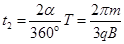 最后出磁场的粒子从OC边上的E点射出,弦ME最长为直径,ME=2R=L,在磁场 中运动的时间为