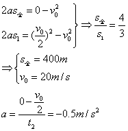 3、计算题 一列火车进站前先关闭气阀(动力系统),让车滑行,滑行了300m时,速度恰为关闭气阀时速度的一半,此后,又继续滑行了20s,停止在车站,设火车在滑行过程中加速度始终保持不变,试求: