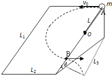 2、简答题  如图所示,一个长L1=0.9m、宽L2=0.6m的光滑斜面体,其倾角θ=30°.有一长度L=0.4m的轻质绳一端固定在距斜面顶点A为L=0.4m斜面边缘的O点上,另一端系一质量m=1kg的小球.现把小球拉至顶点A处,以v0=1m/s的初速度沿斜面顶边缘水平抛出.(g取10m/s2)