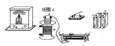 ①电流计、②直流电源、③带铁芯的线圈A、④线圈B、⑤电键、⑥滑动变阻器? 请在实物图上连线(图中已连好一根导线)。 ?