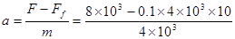 2、计算题 汽车的质量为4×10 3kg,额定功率为30kW,运动中阻力大小为车重的0.1倍。汽车在水平路面上从静止开始以8×10 3N的牵引力出发,求:(g取10m/s2)