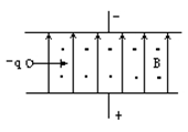 1、填空题 如图所示,质量为m,带电量为-q的粒子,从两平行电极板正中央垂直电场线和磁感线以速度v飞入.已知两板间距为d,磁感强度为B,这时粒子恰能直线穿过电场和磁场区域(重力不计).今将磁感强度增大到某值,则粒子将落到极板上.当粒子落到极板上时的动能为______.