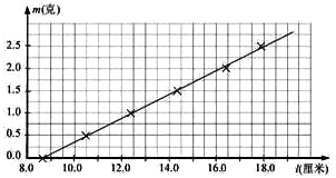 4、实验题 为了测量某一弹簧的劲度系数,降该弹簧竖直悬挂起来,在自由端挂上不同质量的砝码。实验记录了砝码的质量m与弹簧长度l的相应数据,对应点已在图上标出。(g=9.8m/s2)