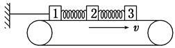 1、选择题 如图所示,在水平传送带上有三个质量分别为m1、m2、m3的木块1、2、3,1和2及2和3间分别用原长为L,劲度系数为k的轻弹簧连接起来,木块与传送带间的动摩擦因数均为μ,现用水平细绳将木块1固定在左边的墙上,传送带按图示方向匀速运动,当三个木块达到平衡后,1、3两木块之间的距离是( )