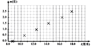 4、实验题 为了测量某一弹簧的劲度系数,降该弹簧竖直悬挂起来,在自由端挂上不同质量的砝码。实验记录了砝码的质量m与弹簧长度l的相应数据,对应点已在图上标出。(g=9.8m/s2)