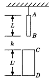 3、计算题 如图所示,悬挂的直杆AB长L=15 m,在距其下端h=5 m处,有一长为L"=15 m的无底圆筒CD,若将悬线剪断,则直杆AB穿过圆筒所用的时间为多少?(g取10 m/s2)