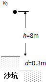 3、简答题 在距沙坑表面高h=8m处,以v0=22m/s的初速度竖直向上抛出一质量m=0.5kg的物体,物体落到沙坑并陷入沙坑d=0.3m深处停下.若物体在空中运动时的平均阻力是重力的0.1倍(g=10m/s2).求:
