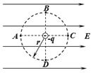 3、选择题 如图所示,在场强大小为E,方向水平向右的匀强电场中,放一个电荷量为-q的点电荷,A、B、C、D四点在以点电荷为圆心、半径为r的圆周上,并且A点、C点与点电荷在同一水平线上,B点、D点与点电荷在同一竖直线上,则下列说法正确的是