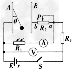 5、选择题 A,B两块正对的金属板竖直放置,在金属板A的内侧表面系一绝缘细线,细线下端系一带电小球。两块金属板接在如图所示的电路中,其中R1为光敏电阻,R2为滑动变阻器,R3为定值电阻。当R2的滑动触头P在a端时闭合开关S。此时电流表A和电压表V的示数分别为I和U。带电小球静止时绝缘细线与金属板A的夹角为θ,电源电动势E和内阻r一定。以下说法正确的是