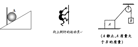 3、作图题 (8分)分别对以下图中的小球A、运动员、木块A、木块B进行受力分析,并画出力的示意图。
