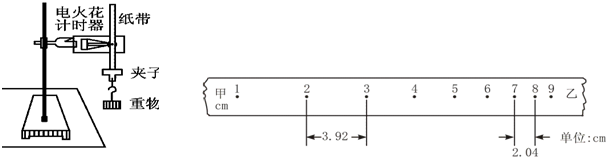 ①电火花计时器的工作电压为______,频率______. ②打出的纸带如图所示,实验时纸带的______端应和重物相连接.(选填“甲”或“乙”) ③纸带上1至9各点为计时点,由纸带所示数据可算出实验时的加速度为______?m/s2. ④当地的重力加速度数值为9.8m/s2,请列出测量值与当地重力加速度的值有差异的一个原因______.