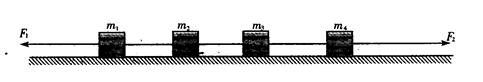2、计算题 质量分别为m1、m2、m3、m4的四个物体彼此用轻绳连接,放在光滑的桌面上,拉力F1、F2分别水平地加在m1、m4上,如图-8所示。求物体系的加速度a和连接m2、m3轻绳的张力F。(F1>F2)