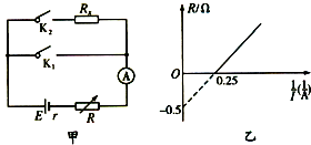 ![]() 4、选择题 如图甲所示.R为电阻箱(0-99.9Ω).置于阻值最大位置,Rx为未知电阻.(1)断开K2,闭合K1,逐次减小电阻箱的阻值,得到一组R,I的值,并依据R,I值作出了如图乙所示的R-