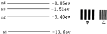 1、选择题 氢原子能级图如图所示,若氢原子发出a、b两种频率的光,在真空中用同一装置做双缝干涉实验,分别得到干涉图样如图甲、乙所示.若?a光是氢原子由能级?n=5向n=2?跃迁时发出的,则关于b光下列说法正确的是( ) A.可能是从能级?n=4向n=2跃迁时发出的 B.可能是从能级?n=4向n=3跃迁时发出的 C.a光在水中的传播速度小于b?光在水中的速度 D.若用a光以α角从玻璃射向空气恰好发生全反射,则?b光以同样的入射角从玻璃射向空气也能发生全反射