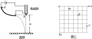 (2)利用该实验装置研究a小球平抛运动的速度,从斜槽同一位置释放小球,实验得到小球运动轨迹中的三个点A、B、C,如图乙所示.图中O为坐标原点,B点在两坐标线交点,坐标xB=40cm,yB=20cm,A、C点均在坐标线的中点.则a小球在B点处的瞬时速度的大小vB=______m/s.