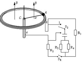 4、简答题 如图所示,水平放置的金属细圆环半径为0.1m,竖直放置的金属细圆柱(其半径比0.1m小得多)的端面与金属圆环的上表面在同一平面内,圆柱的细轴通过圆环的中心O,将一质量和电阻均不计的导体棒一端固定一个质量为10g的金属小球,被圆环和细圆柱端面支撑,棒的一端有一小孔套在细轴O上,固定小球的一端可绕轴线沿圆环作圆周运动,小球与圆环的摩擦因素为0.1,圆环处于磁感应强度大小为4T、方向竖直向上的恒定磁场中,金属细圆柱与圆环之间连接如图电学元件,不计棒与轴及与细圆柱端面的摩擦,也不计细圆柱、圆环及感应电流产生的磁场,开始时S1断开,S2拔在1位置,R1=R3=4Ω,R2=R4=6Ω,C=30uF,求: