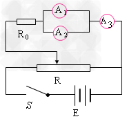 3、实验题 实验室有如下器材; 电流表A1,满偏电流约为500μA(有刻度无刻度值),内阻约600Ω; 电流表A2,量程为0~300μA,内电阻RA2=1000Ω; 电流表A3,量程为0~1mA,内电阻RA3=100Ω; 电压表V:量程0~15V,内阻13kΩ; 定值电阻R0,阻值R0=1kΩ; 滑动变阻器R,最大阻值为5Ω,额定电流2A; 电池:电动势3V,内阻不计; 电键,导线若干; 要求设计一个电路能多测几组实验数据,比较精确地测出A1表的内阻rg和满偏电流Ig。 (1)在方框内画出测量所使用的电路图,并注明各元件符号。