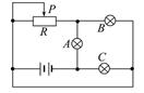 5、选择题 如图所示电路,电源电动势为E、内阻为r,接通电路后A、B、C三盏小灯都达到一定的亮度(但均未达到额定功率),当滑动变阻器的滑动头P向左滑动时,则( )