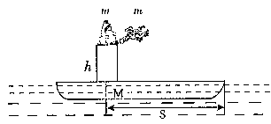 3、简答题 如图所示,在平静的水面上漂浮着一块质量为M=150g的带有支架的木板,木板左边的支架上静静地蹲着两只质量各为m=50g的青蛙,支架高h=20cm,支架右方的水平木板长s=120cm.突然,其中有一只青蛙先向右水平地跳出,恰好进入水中,紧接其后,另一只也向右水平地跳出,也恰好进入水中.试计算:(水的阻力忽略不计,取g=10m/s2,结果保留两位有效数字.)