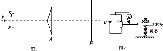 1、简答题 Ⅰ.图1中为“双棱镜千涉”实验装置,其中s为单色光源,A为一个顶角略小于180°的等腰三角形棱镜,P为光屏.s位于棱镜对称轴上,屏与棱镜底边平行.调节光路,可在屏上观察到干涉条纹.这是由于光源s发出的光经棱镜作用后,相当于在没有棱镜时,两个分别位于图中?sl和s2相干波源所发出的光的叠加.(sl和s2的连线与棱镜底边平行.)