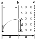 5、计算题 如图所示,竖直放置的两块很大的平行金属板a、b,相距为d,ab间的电场强度为E,今有一带正电的微粒从a板下缘以初速度v0竖直向上射入电场,当它飞到b板时,速度大小不变,而方向变为水平方向,且刚好从高度也为d的狭缝穿过b板而进入bc区域,bc区域的宽度也为d,所加电场大小为E方向竖直向上,磁感强度方向垂直纸面向里,磁场大小等于E/v0。求: