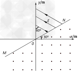 2、计算题 如图所示,在xoy平面内,直线MN与x轴正方向成30°角,MN下方是垂直于纸面向外的匀强磁场,MN与y轴正方向间存在电场强度E=