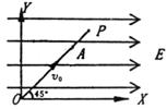 2、计算题 如图所示,真空中有一沿X轴正方向的匀强电场,一质量为m、电量为q的带电微粒从坐标原点O沿OP方向以速度OP与X轴的夹角是45°。(重力加速度为g)v0射入电场,恰能沿直线OP运动,在A点微粒速度变为零。已知