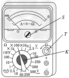 3、实验题 用如图所示的多用电表测量电阻,要用到选择开关K和两个部件S、T。请根据下列步骤完成电阻测量: