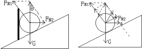 (2)挡板转动时,挡板给球的弹力FN2与斜面给球的弹力FN1合力大小方向不变,其中FN1的方向不变,作辅助图如上,挡板转动过程中,FN2的方向变化如图中a、b、c的规律变化,为满足平行四边形定则,其大小变化规律为先变小后变大,其中挡板与斜面垂直时为最小.与此对应,FN1的大小为一直减小.