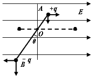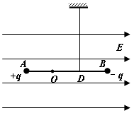 3、计算题 如图所示,绝缘轻杆长L=0.9m,两端分别固定着带等量异种电荷的小球A、B,质量分别为mA=4×10-2kg,mB=8×10-2kg,A球带正电,B球带负电,电荷量q=6.0×10-6C。轻杆可绕过O点的光滑水平轴转动,OB=2OA。一根竖直细线系于杆上OB中点D使杆保持水平,整个装置处在水平向右的匀强电场中,电场强度E=5×104N/C。不计一切阻力,取g=10m/s2,求:
