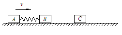 3、计算题 (9分)两物块A、B用轻弹簧相连,质量均为2 kg,初始时弹簧处于原长,A、B两物块都以v=6 m/s的速度在光滑的水平地面上运动,质量4 kg的物块C静止在前方,如图所示。B与C碰撞后二者会粘在一起运动。求在以后的运动中: