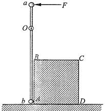 4、计算题 如图所示,一根长为三的细刚性轻杆的两端分别连结小球a和b,它们的质量分别为ma和mb,,杆可绕距a球为L/4处的水平定轴D在竖直平面内转动,初始时杆处于竖直位置,小球b几乎接触桌面,在杆的右边水平桌面上,紧挨着细杆放着一个质量为m的立方体匀质物块,图中ABCD为过立方体中心且与细杆共面的截面.现用一水平恒力F作用于a球上,使之绕O轴逆时针转动,设在此过程中立方体物块没有发生转动,且小球b立方体物块始终接触没有分离.不计一切摩擦,求: