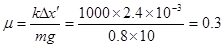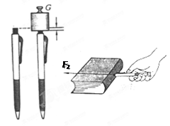 2、计算题 有一种圆珠笔,内部有一根小弹簧。如图所示,当笔杆竖直放置时,在圆珠笔尾部的按钮上放一个200g的砝码,砝码静止时,弹簧压缩量为2mm。现用这支圆珠笔水平推一本放在桌面上质量为800g的书,当按钮压缩量为2.4mm(未超过弹簧