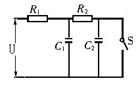 3、计算题 如图所示电路,U恒为10V、R1=4Ω、R2=6Ω、C1=C2=30μF,先闭合开关S,待电路稳定后再断开S,求