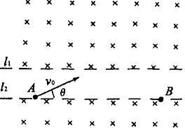 2、计算题 如图所示,l1和l2为距离d=0.lm的两平行的虚线,l1上方和l2下方都是垂直纸面向里的磁感应强度均为B=0.20T的匀强磁场,A、B两点都在l2上.质量m=1.67×10-27kg、电量q=1.60×10-19C的质子,从A点以v0=5.0×105m/s的速度与l2成θ=45°角斜向上射出,经过上方和下方的磁场偏转后正好经过B点,经过B点时速度方向也斜向上.求(结果保留两位有效数字):
